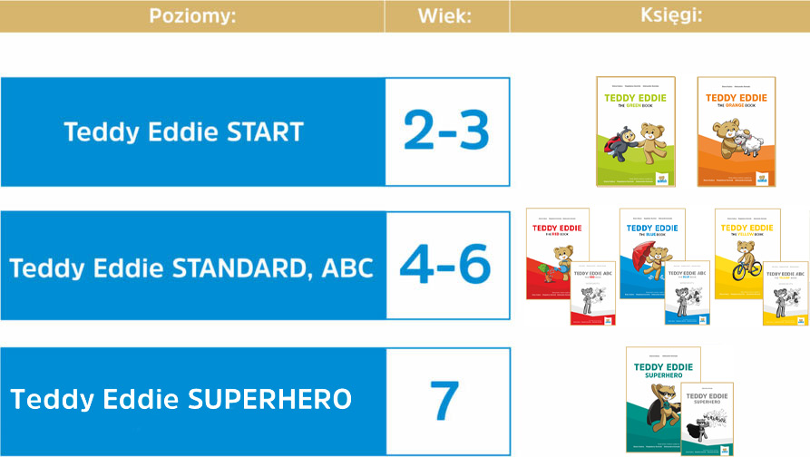 Dodając do oferty Teddy Eddie poziom SUPERHERO, wyszliśmy naprzeciw potrzebom i oczekiwaniom dzieci, które rozpoczynają naukę w szkole podstawowej. Wiemy, że angielski dla 7-latka to zarówno zabawa, jak i początek budowania świadomości językowej oraz motywacji, która zaprocentuje w kolejnych latach nauki. Nasz TEDDY EDDIE zamienił się w Superbohatera, tak aby angielski dla pierwszoklasisty kojarzył się z tym, że… językowo może wszystko, gdyż TEDDY EDDIE nadaje dzieciom super moce!